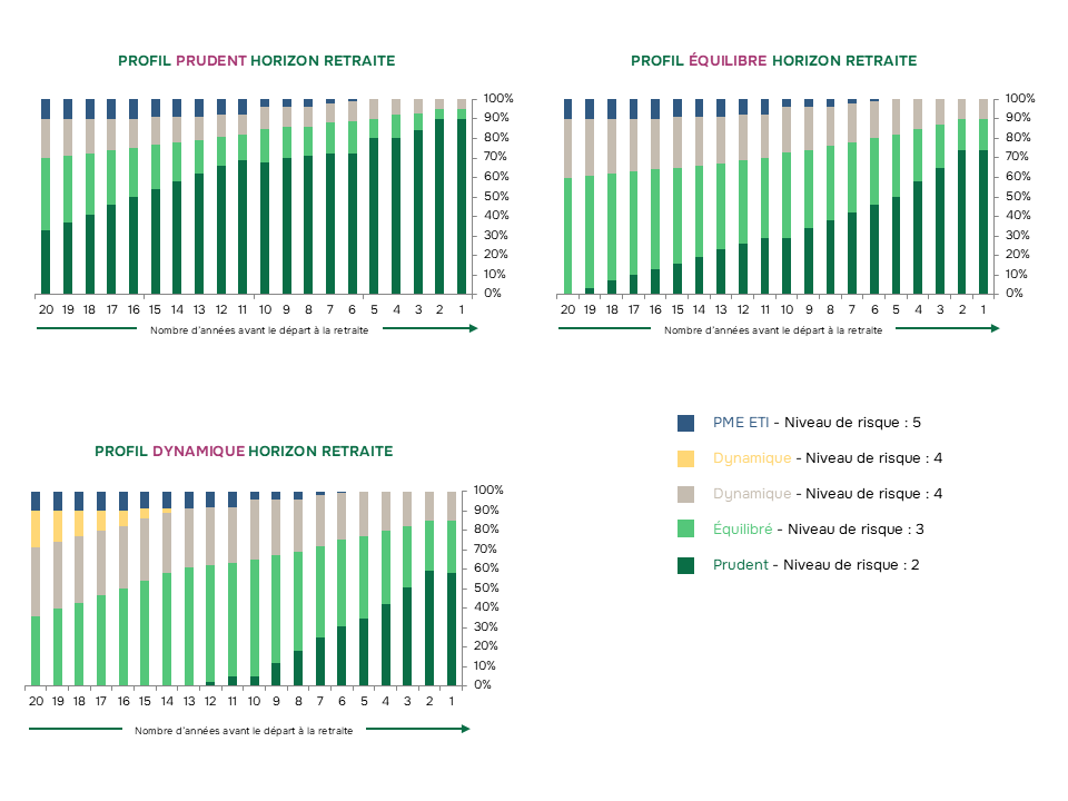 - Votre épargne se désensibilise au risque grâce à une orientation progressive vers des fonds plus sécurisés. Le tout, dans une optique d’investissement à long terme.